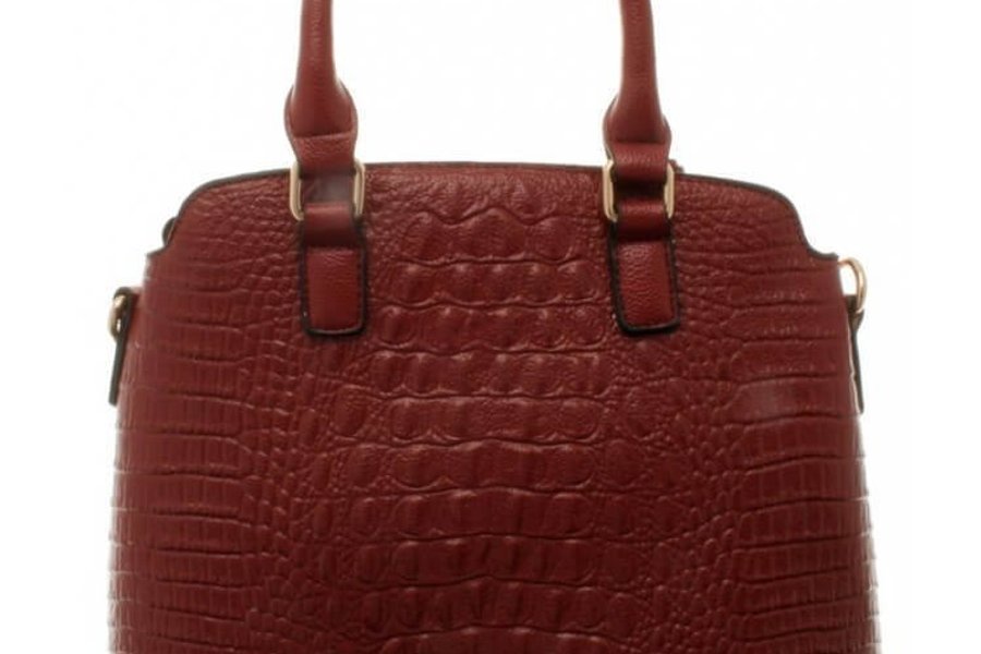 Röd väska med ormskinnsliknande struktur i konstläder