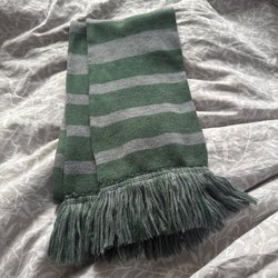 En virkad halsduk i en ljusgrön nyans med fransar. Halsduken har ett ribbat mönster. Halsduken är ca 175 cm lång utan fransarna.