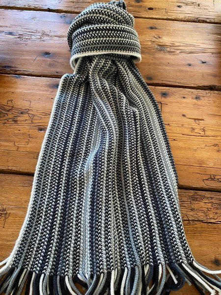 Halsduk stickad i gråa nyanser och mäter ca 195x30 cm. Kommer från rök och djurfritt hem. Superfint skick Köpare betalar frakten