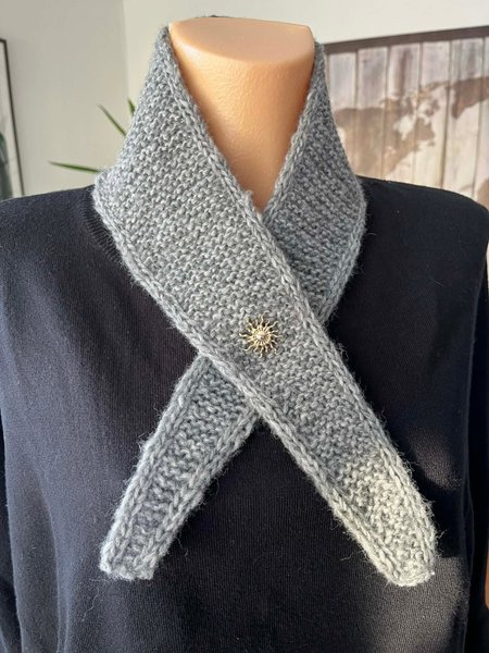 Grå stickad krage med en dekorativ brosch i form av en sol. Kragen är designad för att bäras korsad framtill och fäst med broschen, vilket ger en stilren och värmande detalj till din outfit. Den har en ribbad kant längs sidorna.