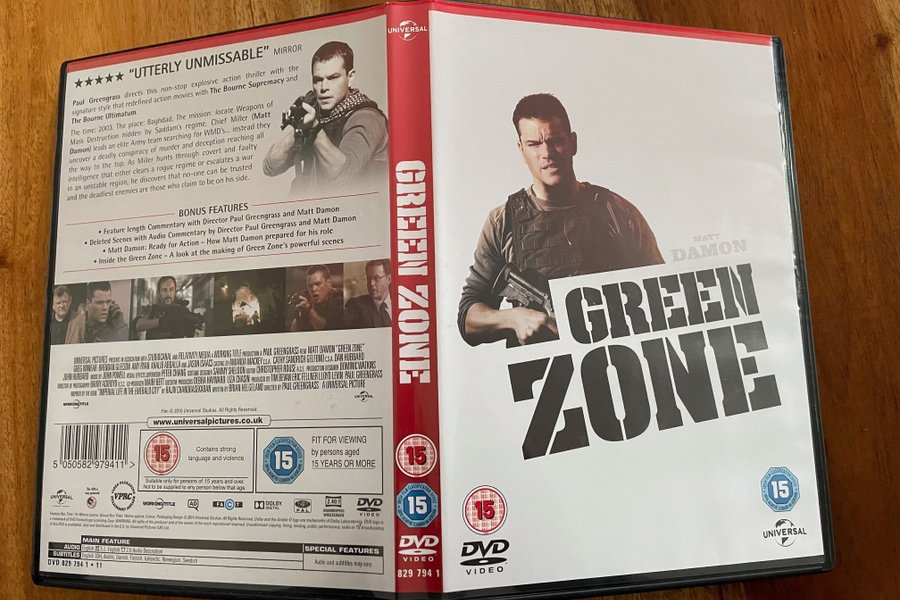 Green Zone på DVD med Matt Damon. Filmen är en actionthriller som utspelar sig i Bagdad år 2003. Den handlar om ett team som söker efter massförstörelsevapen men upptäcker en komplott. DVD:n innehåller bonusmaterial som kommentarer och borttagna scener.