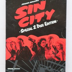 Sin City DVD. Filmen är baserad på Frank Millers serier och regisserad av Robert Rodriguez och Frank Miller, med Quentin Tarantino som gästregissör. Skådespelare inkluderar Bruce Willis, Mickey Rourke, Jessica Alba och Clive Owen.