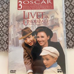 DVD-film ”Livet är underbart” av Roberto Benigni. Filmen har vunnit 3 Oscar för Bästa manliga huvudroll, Bästa utländska film och Bästa musik (drama).