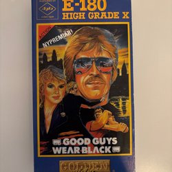 VHS-kassett med filmen "Rambo's Hämnd" från Westcon Home Video. Filmen har en speltid på 90 minuter och är textad på svensk ". Kassetten är märkt E-180 Super High Grade.