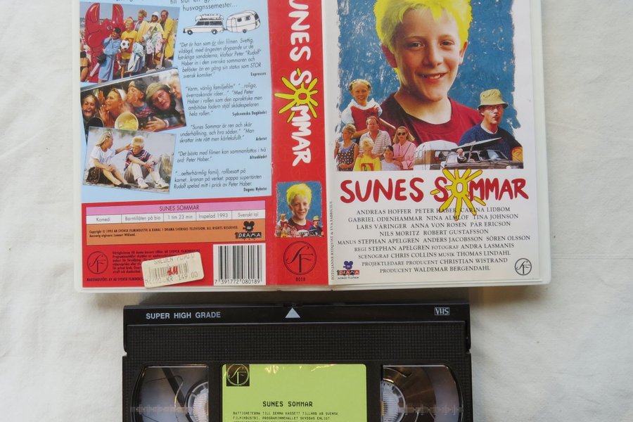 VHS-utgåva av "Sunes Sommar" från 1993. Filmen är en komedi och har en speltid på 1 timme och 23 minuter. Språket är svenskt tal. Medverkande inkluderar Andreas Hoffer, Peter Haber, Carina Lidbom, Gabriel Odenhammar, Nina Almlöf, Tina Johnson, Lars Väringer, Anna von Rosen, Pär Ericson, Nils Moritz och Robert Gustafsson. Regisserad av Stephan Apelgren.