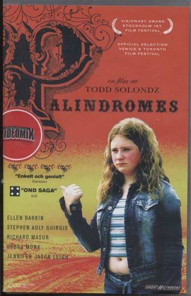 VHS-film "Palindromes" av Todd Solondz. Medverkande skådespelare är Ellen Barkin, Stephen Adly Guirgis, Richard Masur, Debra Monk och Jennifer Jason Leigh. fd hyrfilm i mycket gott skick. svensk text. (2004) 96 min.