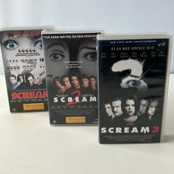 Scream 2 på VHS. En ny thriller av Wes Craven, skriven av Kevin Williamson. Med David Arquette, Neve Campbell, Courteney Cox, Sarah Michelle Gellar, Jamie Kennedy, Jerry O'Connell, Jada Pinkett och Liev Schreiber.