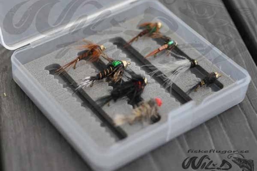8 stycken mixade fiskeflugor med smidig liten flugask.