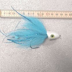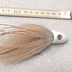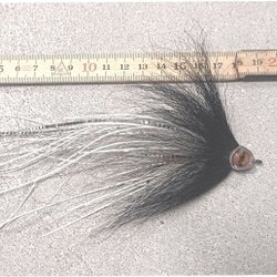 Gäddfluga för flugfiske efter gädda. Bunden på Ahrex 4/0 i färgerna rött och svart. Längd ca. 18 cm.