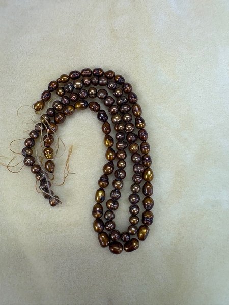 Två strängar av sötvattenspärlor. Strängarna är ca 40 cm långa. De är från 6 mm till 8 mm stora och oregelbundna i formen.