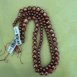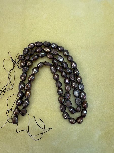 Två strängar av sötvattenspärlor. Strängarna är ca 40 cm långa. De är från 8x10 stora och oregelbundna i formen.