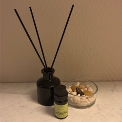 Doftspridare med svarta pinnar (ingen vätska medföljer, endast lilla eteriska oljan)och en flaska med vaniljdoft. Ett glas med dekorationsstenar medföljer.