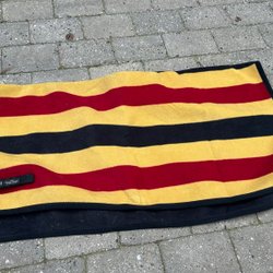 Ett marinblått skrittäcke med ljusblå/vit rutig kant. Svanssnöre. Knäpps med kardborre framför sadeln. Strl 145.