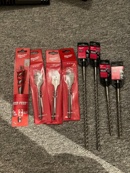 Milwaukee borr set med olika dimensioner. Inkluderar borr med diameter 25mm och SDS-plus borr.