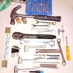 Ett varierat sortiment av verktyg för olika ändamål. Inkluderar bland annat skiftnycklar, avbitare, borr, insexnycklar och specialverktyg.