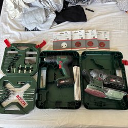 Ett set med olika verktyg, inklusive borrar, hylsnycklar och Bosch-skruvmejselsats