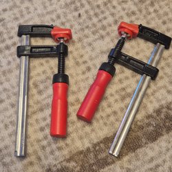 Två tvingar i blått och turkost. Perfekta för att säkra arbetsstycken vid snickeri, limning eller andra projekt. De har en robust konstruktion och är enkla att hantera.