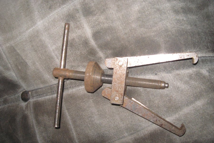 Avdragare för verkstadsbruk. Verktyget har en T-formad stång och en gängad spindel med en konisk del. Två armar med krokar är fästa vid spindeln.