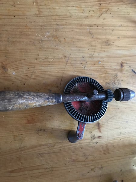 Handborr med trähandtag och metallkonstruktion. Verktyget har ett rött hjul och en vev.