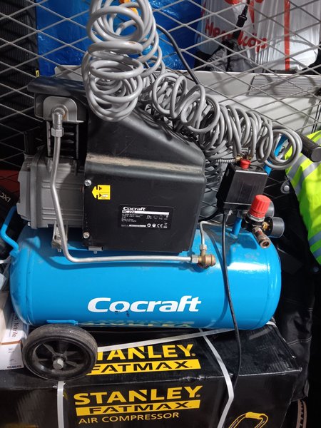 Sparsamt andvänd köpte ny med större tank med samma effekt kommer med slang. Cocraft HC 224 luftkompressor. Modellnummer L224. 1500 W, 230 V, 50 Hz, 2hp 24L