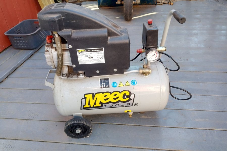 Meec Tools luftkompressor med en tankvolym på 24 liter. Kompressorn har en effekt på 1,1 kW (1,5 hk) och ett maximalt arbetstryck på 8 bar. Den är utrustad med hjul och handtag för enkel förflyttning. Luftflödet är 180 l/min och varvtalet är 2850 min. Ljudnivån är 97 dB.