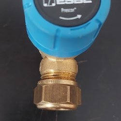 Pressure reducing valve. It is made of brass and has a grey plastic top. It has threaded connections on three sides.