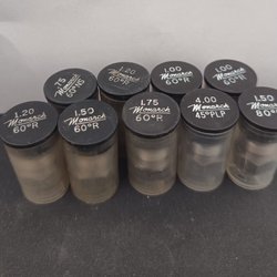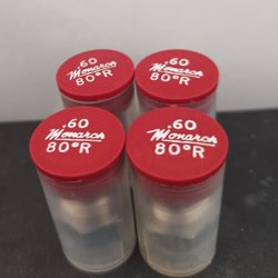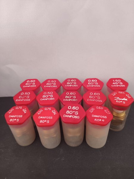 Danfoss oljemunstycken med olika specifikationer. Munstyckena har märkningar som 0.50 60°S, 0.50 80°S, 0.60 80°S, 0.60 60°S, 1.50 45°S, 0.75 80°S och 0.65 60°S.