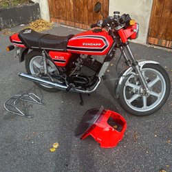 3växlad. Med 2.9 cylle 17 mm förgasare ny framgaffel nya fälgar med nya däck nytt sadel nya bromsar stötdämpare bak avgasrör ca 65km går bra i motorn