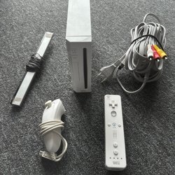 Nintendo Wii med tillbehör enligt bild. Inkluderar strömadapter, sensor bar, AV-kabel, Wii remote och nunchuk
