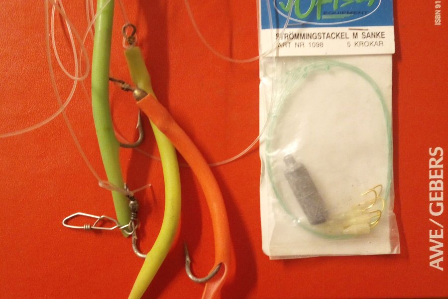 Tre krokar klar för fiske med bete på krokarna. Längd 10,5cm och ett nytt strömmingstackel med sänke