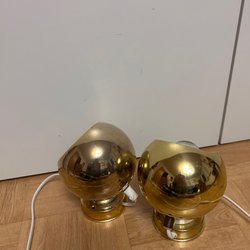 En charmig retro lampa med två röda lampskärmar. Lampan har en guldfärgad detalj och en vit sladd med stickkontakt. Perfekt för att skapa en mysig och nostalgisk atmosfär i hemmet.