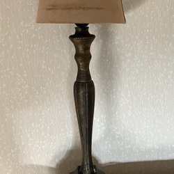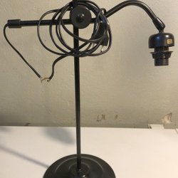 Bordlampe med en højde på 30 cm. Lampen har en sort top og en grå base. Den er udstyret med en ledning og stik.