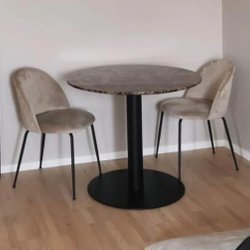 två stolar av modellen Kiwi från Mio. Stolarna är i sandfärgad sammet med svarta ben.