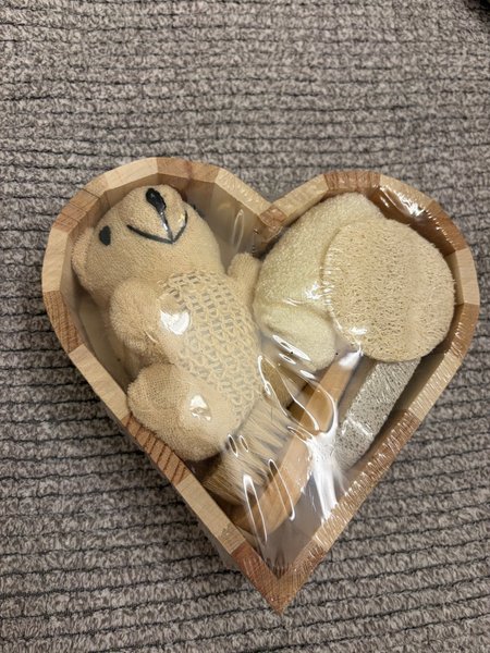 Ett fint badset i en hjärtformad träask. Innehåller en mjuk teddybjörn, en tvättsvamp, en borste och en pimpsten.