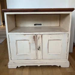 Säljer en TV-bänk med förvaring.