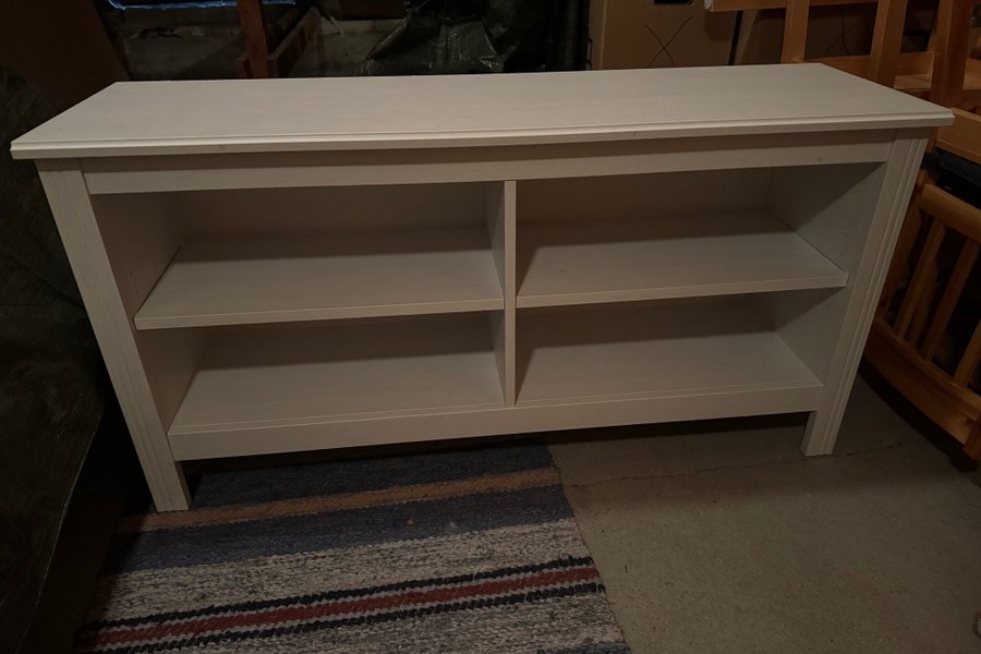 Vit TV-bänk med fyra fack i två hyllplan.