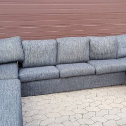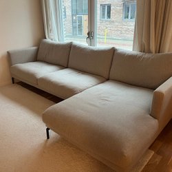 En soffa med plats för flera personer. Den har en unik design och är bekväm att sitta i.
