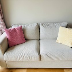 Bekväm soffa med många kuddar. Perfekt för mysiga stunder hemma.