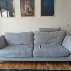 En grå soffa med plats för tre personer. Perfekt för vardagsrummet eller gästrummet.