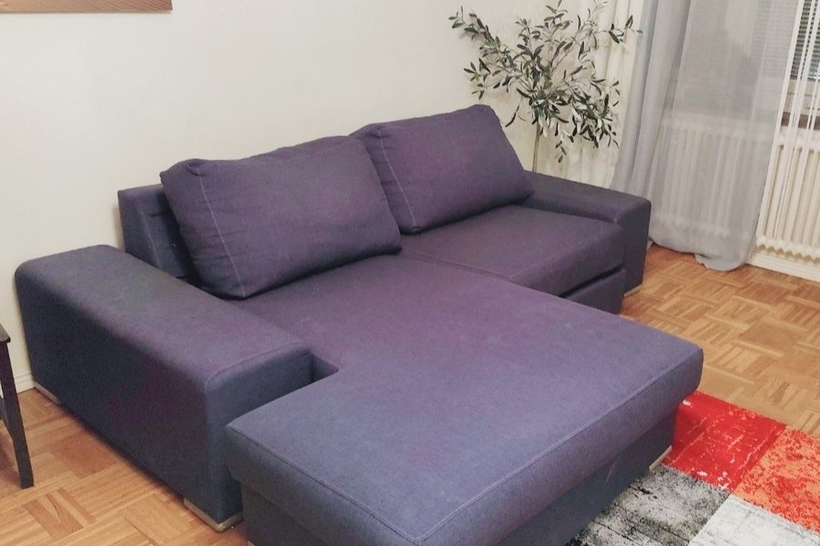 Soffa med divan 2,45 * 1,80 m, i mörkblått tyg. Soffan har två ryggkuddar och armstöd på vänster sida. Divanen justeringsbar, dvs går att placera på både höger eller vänstra sida. Finns lite fläcker som går att tvätta bort.
