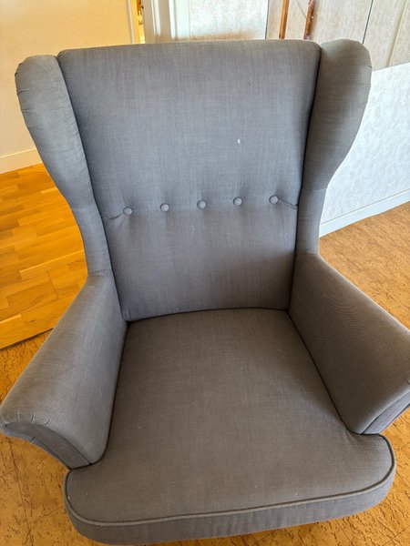 Fåtölj i grått tyg med knappar i ryggen. Passar bra som en bekväm sittplats i vardagsrummet eller som en läsfåtölj.