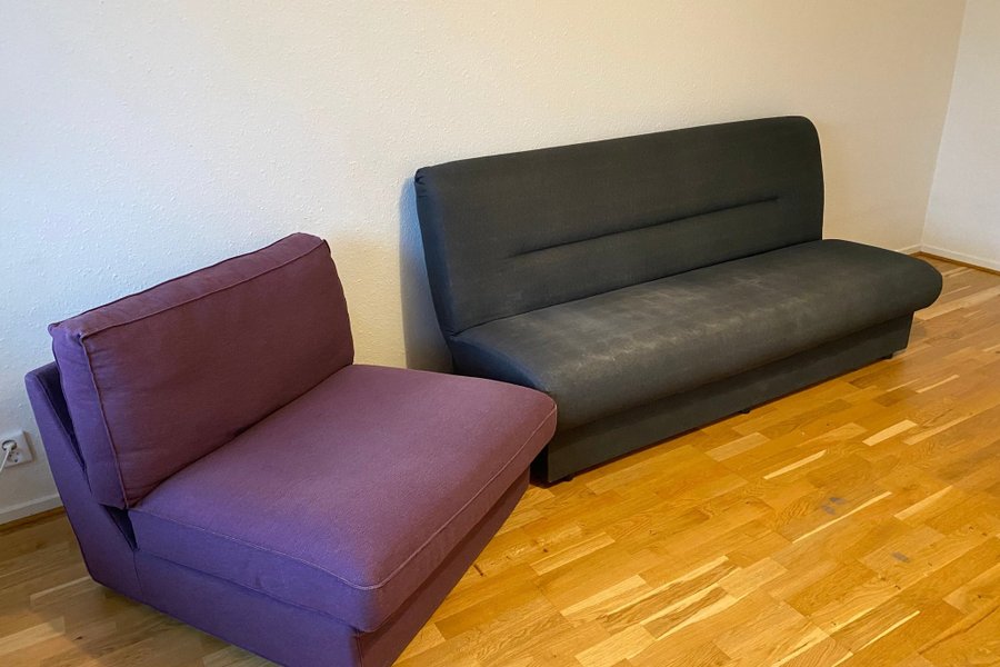 En grå soffa och en lila fåtölj säljes.