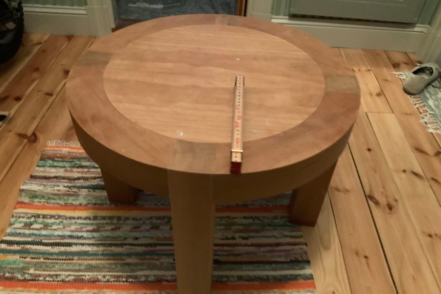 Ett runt träbord med robusta ben. Perfekt som soffbord eller sidobord.endast avhämtning i Huddinge 450 högt 600 rakt över i körsbär
