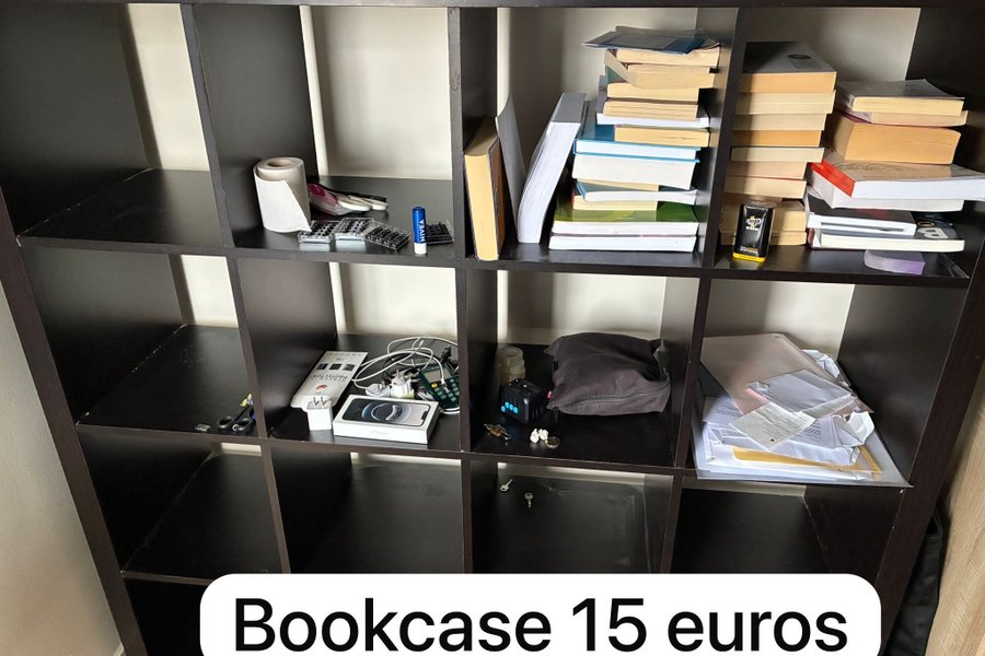 Boekenkast met 15 vakken. De kast is donkerbruin van kleur en biedt veel opbergruimte.