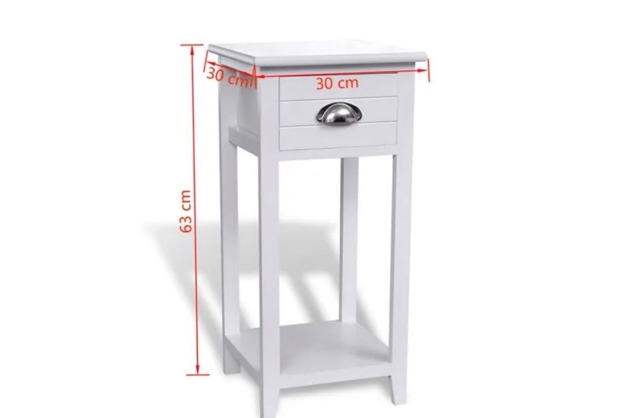 Sängbord i vit färg med nedre hylla och låda med silvrigt handtag. Nyskick.