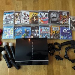 Playstation 3 med 5 handkontroller (en kan vara dålig), tangentbord, 2 mikrofoner (slitna men fungerande), Playstation Move kamera och kontroll. 6 spel: Cars, Cars driven to win, FIFA 13, ABBA Singstar, Singstar Party och Lego Harry Potter.