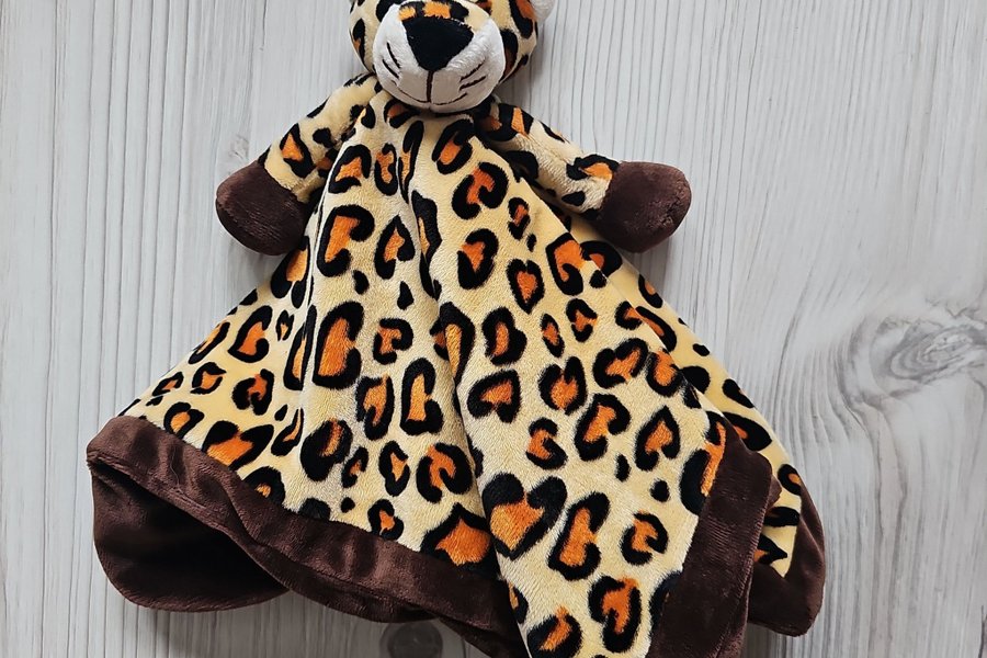 En snuttefilt med leopardmönster. Filten har ett leopardhuvud med broderade ögon och nos. Kanterna och insidan är brun.