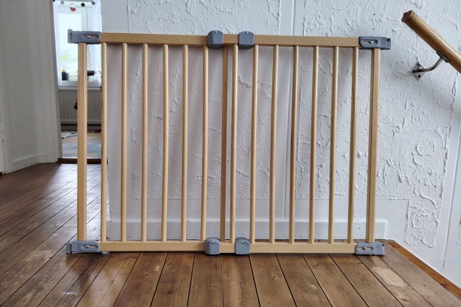 En barngrind i trä av märket BabyDan som går att justera till önskad längd (upp till ungefär 100cm). Perfekt för att säkra trappor och dörröppningar. Monteras enkelt. Använd, men fortfarande i jättefint skick.