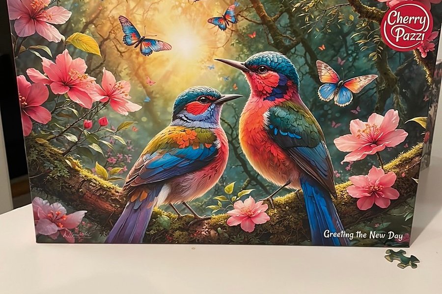 Ett pussel med motiv av fåglar och blommor. Märket är Cherry Pazzi och det är 500 bitar.