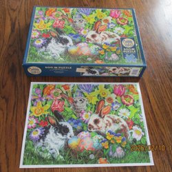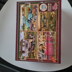 Ett pussel från Cobble Hill. Pusslet har en linne-textur och är tillverkat av återvunnet material. Bitarna är slumpmässigt formade.